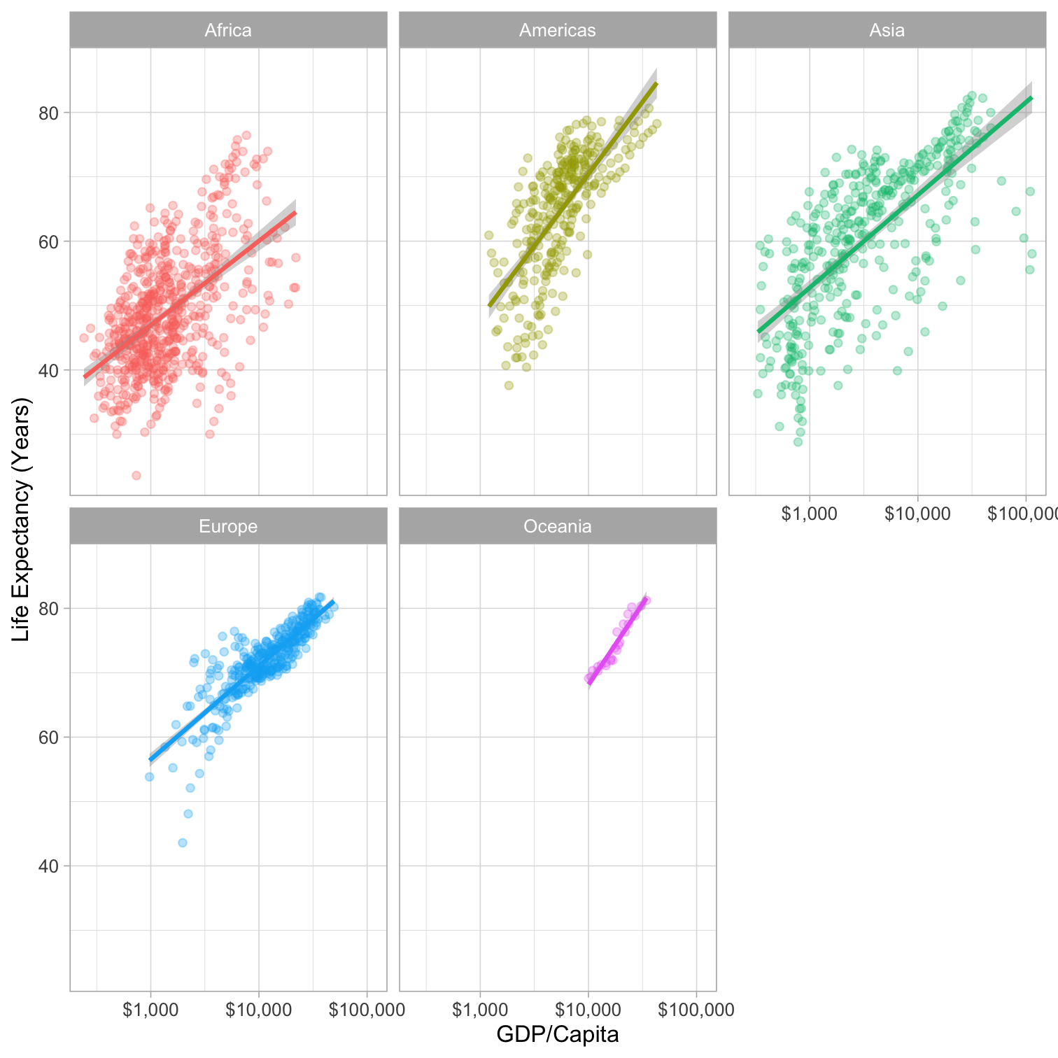 library("gapminder")ggplot(data = gapminder, aes(x = gdpPercap, y = lifeExp, color = continent))+ geom_point(alpha=0.3)+ geom_smooth(method = "lm")+ scale_x_log10(breaks=c(1000,10000, 100000), label=scales::dollar)+ labs(x = "GDP/Capita", y = "Life Expectancy (Years)")+ facet_wrap(~continent)+ guides(color = F)+ theme_light()