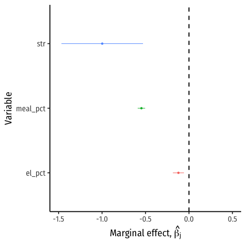 ggplot(data = reg_tidy_no_int)+ aes(x = estimate, y = term, color = term)+ geom_point()+ # point for estimate # now make "error bars" using conf. int. geom_segment(aes(x = conf.low, xend = conf.high, y=term, yend=term))+ # add line at 0 geom_vline(xintercept=0, size=1, color="black", linetype="dashed")+ scale_x_continuous(breaks=seq(-1.5,0.5,0.5), limits=c(-1.5,0.5))+ labs(x = expression(paste("Marginal effect, ", hat(beta[j]))), y = "Variable")+ guides(color=F)+ # hide legend theme_classic(base_family = "Fira Sans Condensed", base_size=20)